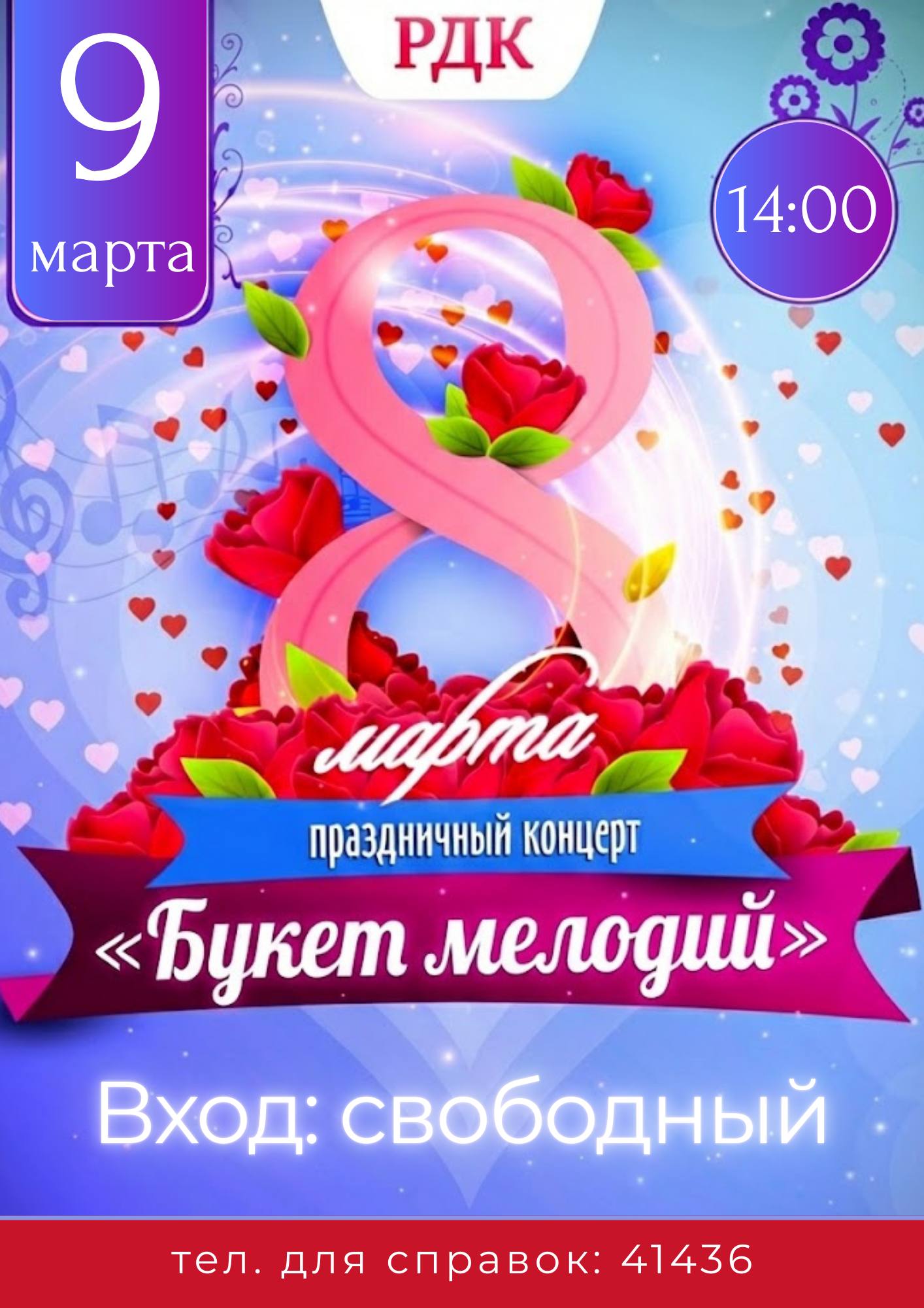 Для вас выступят лучшие артисты района! В программе — тёплые лирические песни, яркие вокальные номера и море весеннего настроения. Пусть этот день запомнится улыбками и приятными эмоциями!